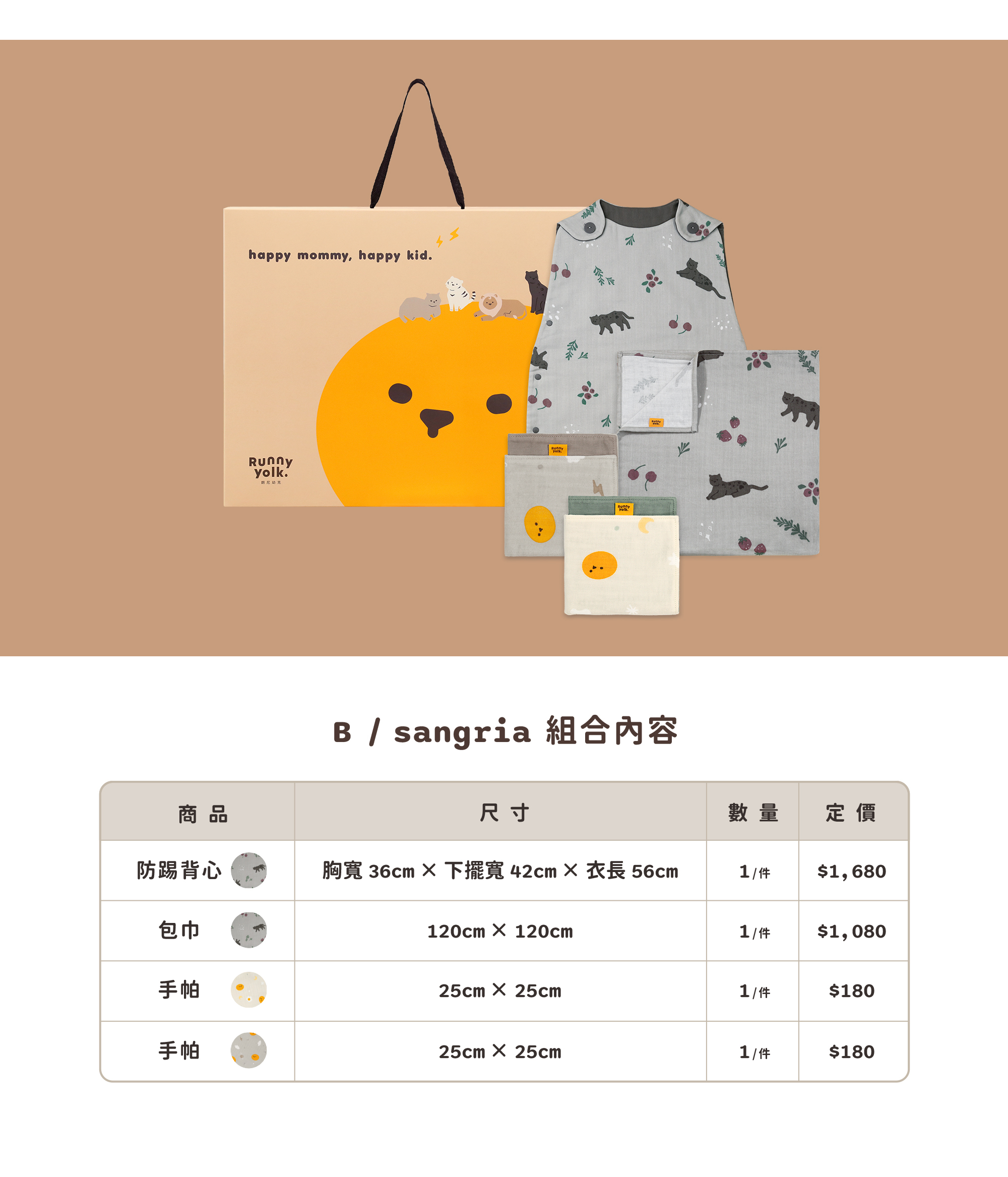 • 防踢背心X1/包巾X1/小方巾X2,含禮盒包裝