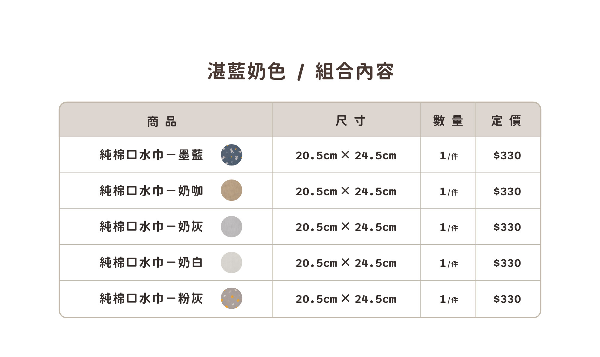 • 奶灰、奶白、奶咖、粉灰、墨藍口水巾各一
