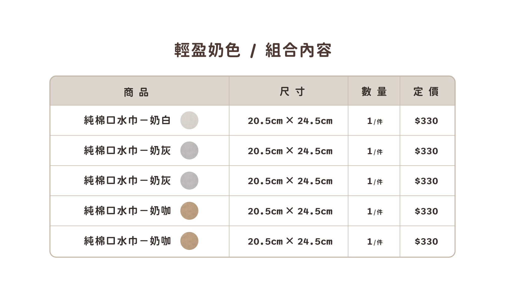 • 奶白口水巾x1、奶灰口水巾x2、奶咖口水巾x2