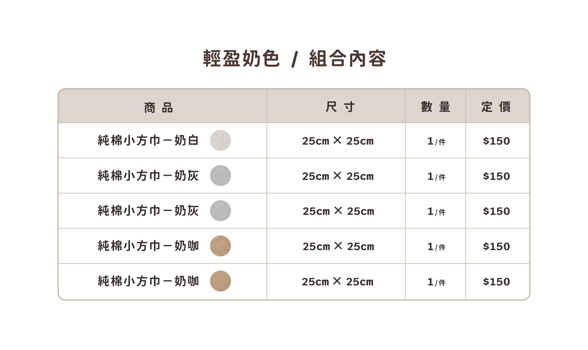 • 奶白小方巾x1、奶灰小方巾x2、奶咖小方巾x2