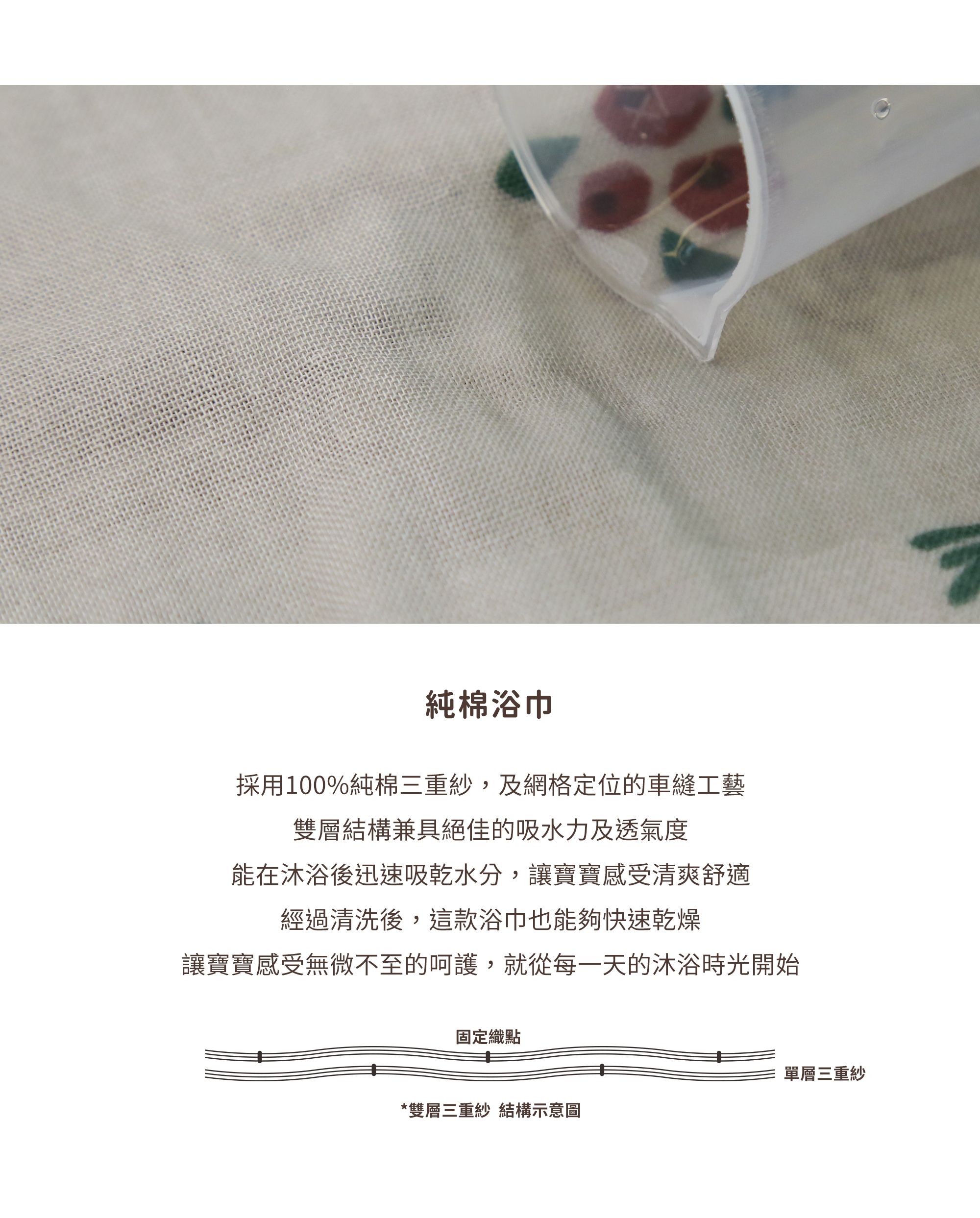 • 100% 純棉三重紗,蓬鬆柔軟,舒適親膚