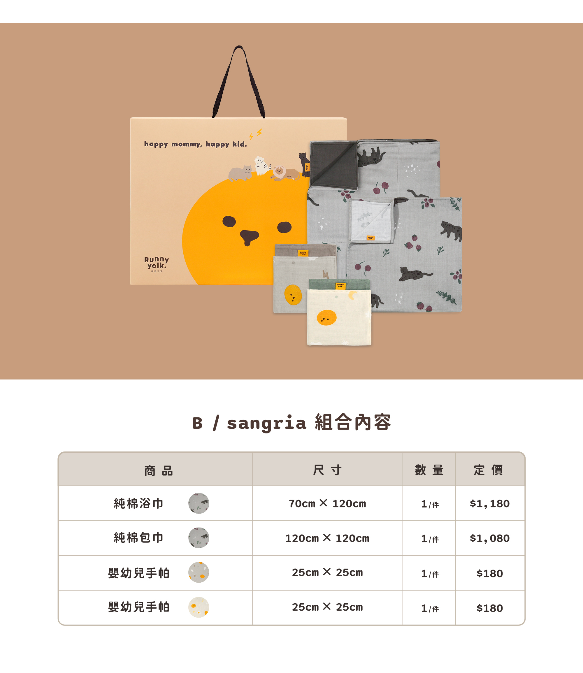 • 小方巾 x 2 / 浴巾 x 1 / 包巾 x 1,含禮盒包裝